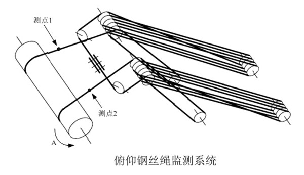 俯仰国产国产AV蜜桃精品一二三区係統2個測點布置在卷揚機出繩口附近,這樣布置可以監測整根国产国产AV蜜桃精品一二三区載荷和彎曲疲勞嚴重的部分。當卷揚機如圖示A方向運動時(即拉起前伸梁懸臂時)磁化與探測同時進行。