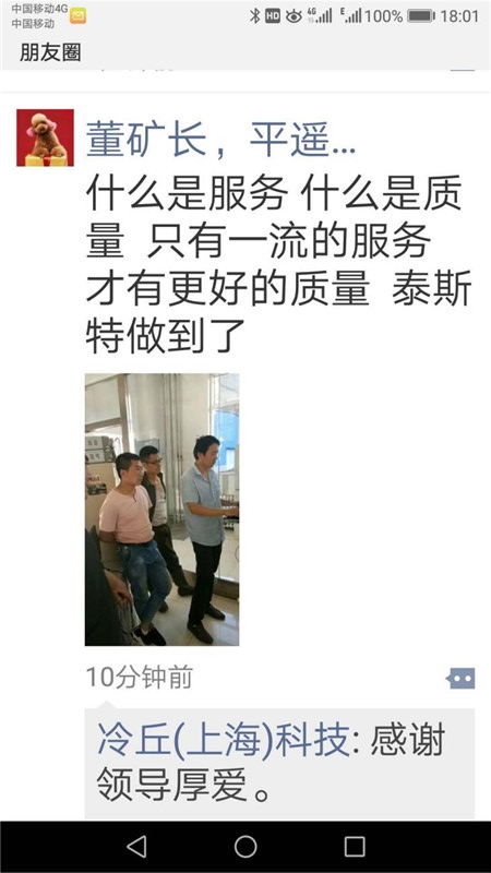 2018年6月28日,工程部技術工程師翟碩飛在平遙興盛鴻發礦進行售後服務過程中,體現出的業與態度獲得了客戶的好評,平遙煤化董礦長將其轉發朋友圈,為泰斯點讚,高度讚揚了泰斯業、負責、高的工作作風,這是次客戶在公開場合對公司進行點讚,並進行傳播。這是泰斯公司的光榮,也是整個售後團隊的光榮。