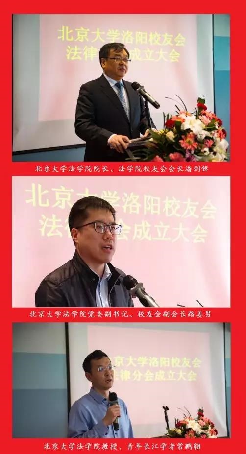 2019年4月13日上午,北京大學洛陽校友會法律分會成立大會在洛陽市喜鵲愉家賓館二樓會議室隆重舉行。北京大學法學院院長、法學院校友會會長潘劍鋒,法學院黨委副書記、法學院校友會副會長路薑男,法學院教授、青年長江學者常鵬翱,法學院校友會辦公室主任黨淑平和副主任魯昕鑫親臨大會。北京大學洛陽校友會副會長洛陽泰斯探傷技術有限公司CEO竇伯英來自校友會教育委會、健康委會以及部分律師事務所的校友代表起參加大會。北京大學新疆校友會副會長兼秘書長聶寧程到會祝賀。北京大學洛陽校友會會長郭引強與會,校友會副會長兼秘書長劉曉鵬主持會議。