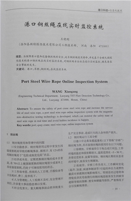 隨著公司新市場開拓不斷深入,市場反響逐漸升溫,尤其是麵對港口行業對国产国产AV蜜桃精品一二三区安全問題關注度和解決方案渴求的急劇提升,針對港口行業的特殊工況環境和安規範要求,我公司和某港口達成戰略合作夥伴友好關係,為該港現場各類提升設備国产国产AV蜜桃精品一二三区提供安全監測方案。豐富完備的港口現場數據和行業的国产国产AV蜜桃精品一二三区磁檢測技術結合成係列港口用国产国产AV蜜桃精品一二三区在線實時智能監測係統。為了推而廣之向更多港口客戶提供TST產品保障安全的科技力量,同時也為了讓港口客戶對TST產品及技術方案在港口適用性有充分詳細的了解,TST 公司在港口行業權威性期刊《港口科技》20163月刊出《港口国产国产AV蜜桃精品一二三区在線實時監控係統》論文。